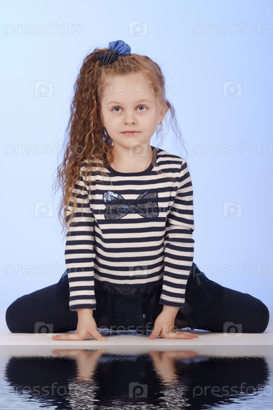 Рыжая девочка сидит на голубом фоне и отражается в воде