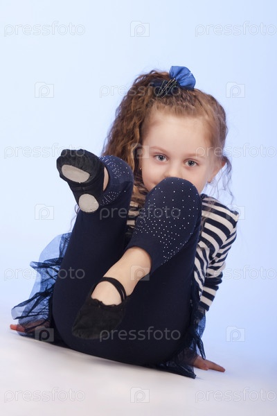 Девочка в танцевальном костюме позирует, сидя на полу, на голубом фоне