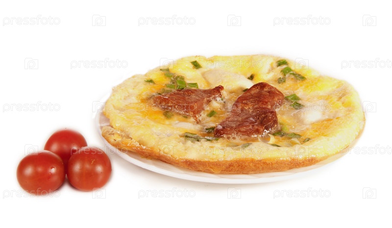 Яичница с кусочками мяса и три помидора