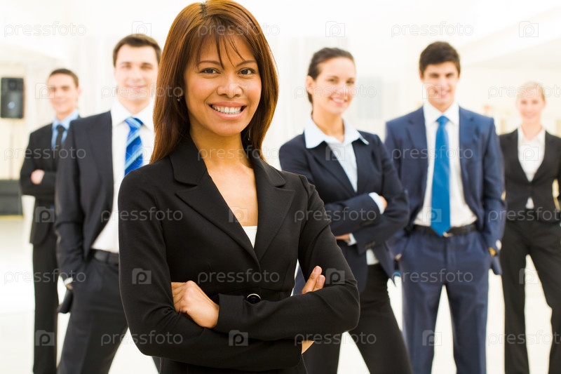 Портрет успешной бизнес-леди, смотрящей на камеру со своей рабочей командой в фоне