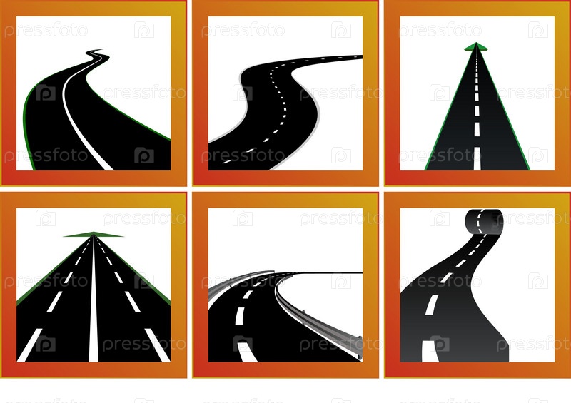 Иконки с изображением асфальтированной дороги. Дороги и направления. Коллаж
