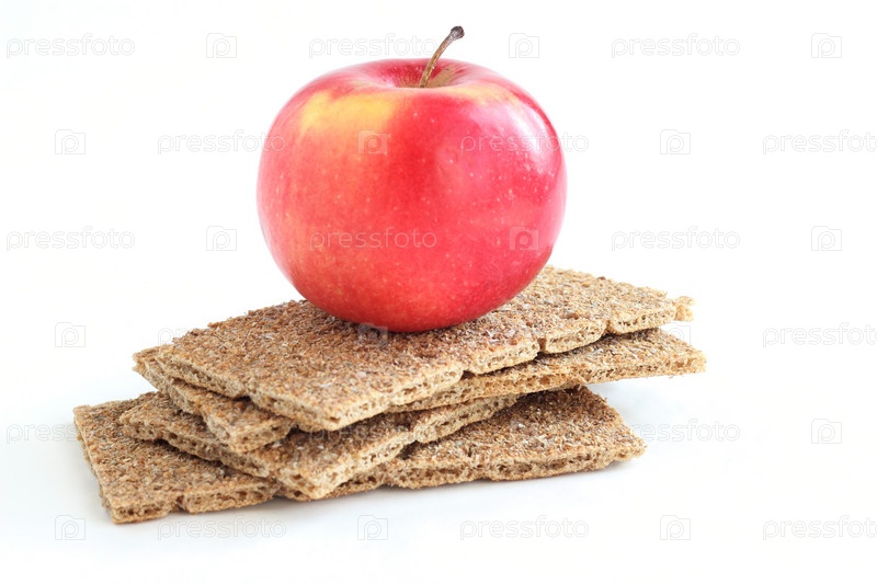 Красное яблоко и хрустящие хлебцы на белом фоне