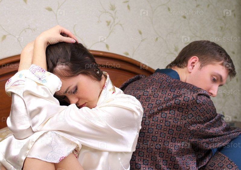 Молодая семейная пара, сидящая в постели спинами друг к другу