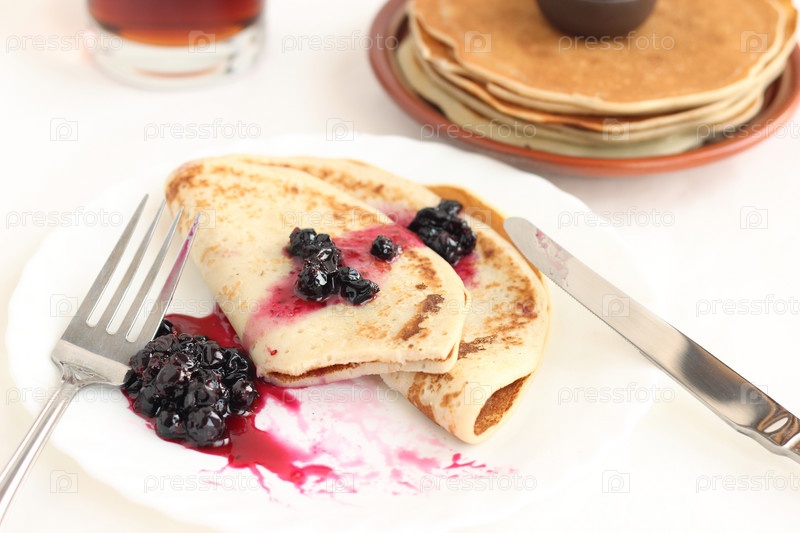 Блины с вареньем из черной смородины и чай
