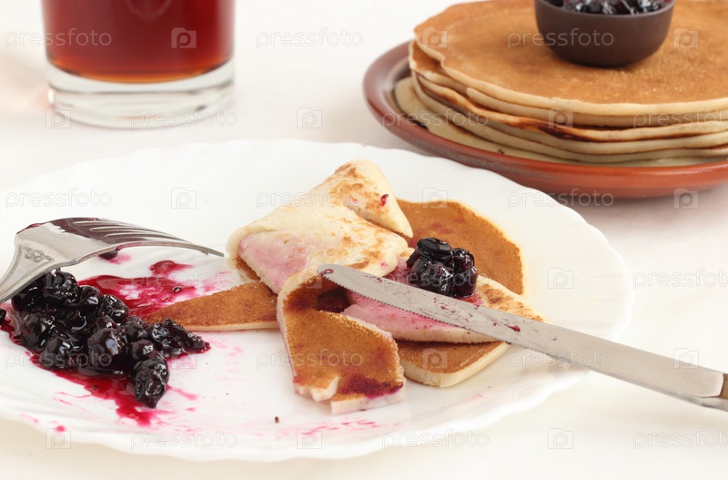 Блины с вареньем из черной смородины и чай