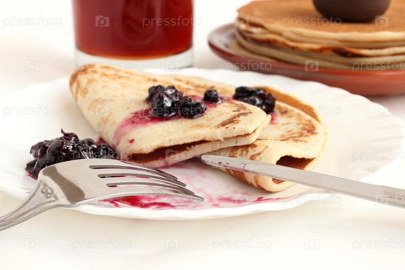 Блины с вареньем из черной смородины и чай