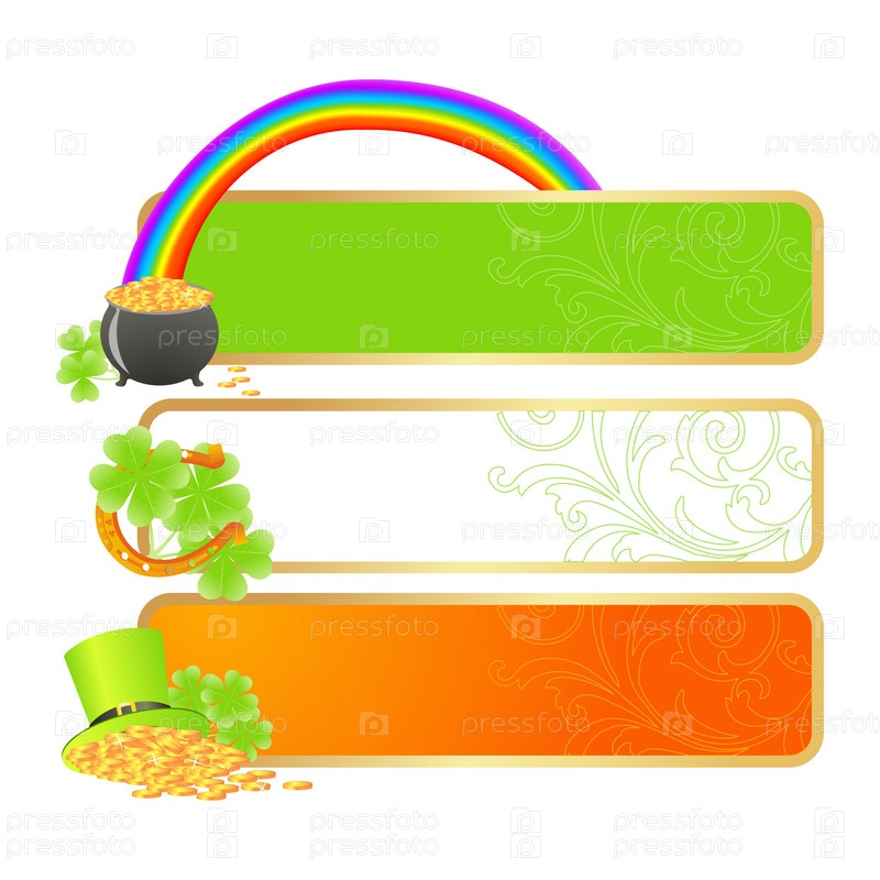Баннеры к Дню святого Патрика в цветах ирландского флага и символы - шляпа Лепрекона, горшок с золотом и подкова