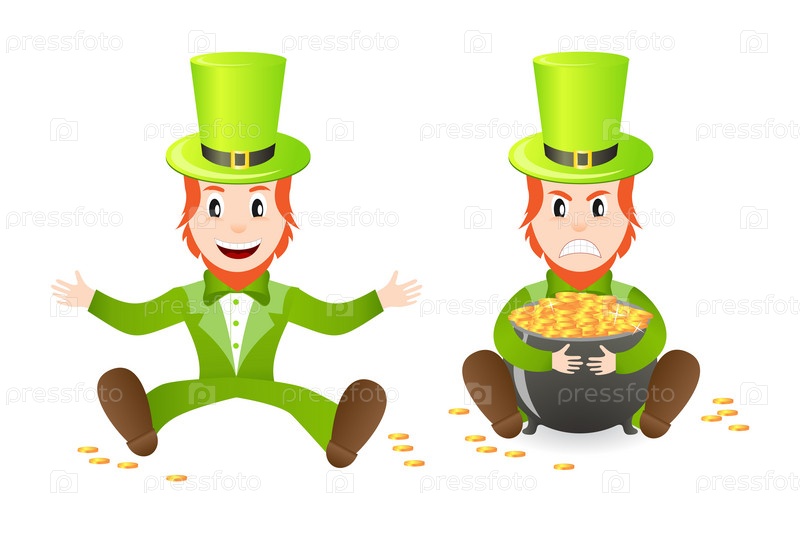 Веселый и злой Лепрекон с сокровищем, иллюстрация на белом фоне