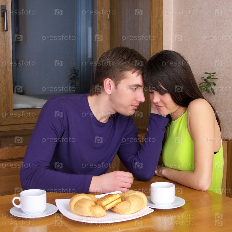 Портрет молодой семейной пары, сидящей за столом у себя на кухне