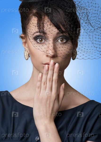 Портрет удивленной женщины, одетой в стиле ретро, изолировано на голубом