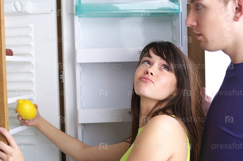 Молодая пара перед пустым холодильником, женщина держит лимон