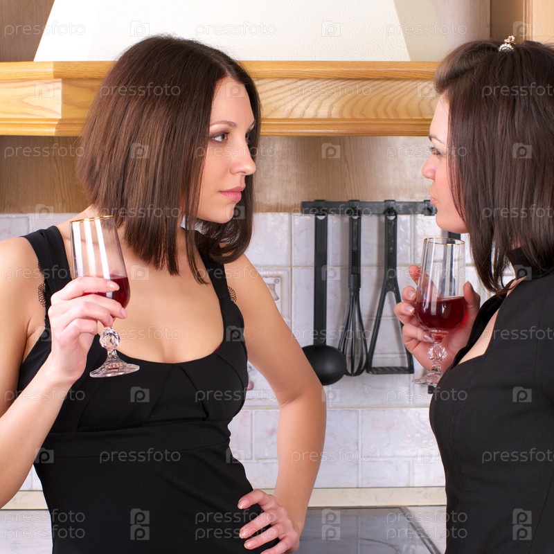 Две молодые красивые женщины с бокалами красного вина спорят о чем-то на кухне