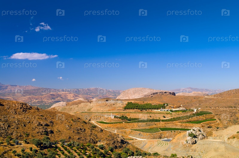 Прекрасный летний пейзаж с горами, долиной и садами, Греция