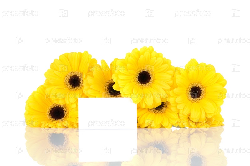 Желтые герберы и открытка на белом фоне