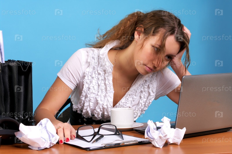 Симпатичная деловая женщина устало смотрит на ноутбук, сидя на рабочем месте