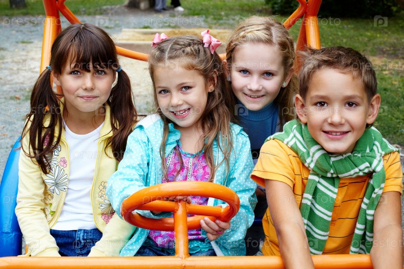 Счастливые дети в игрушечном автомобиле на детской площадке