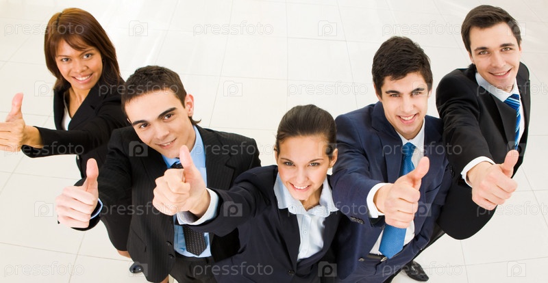 Выше вид нескольких успешных сотрудников, улыбающихся на камеру и показывающих большие пальцы вверх