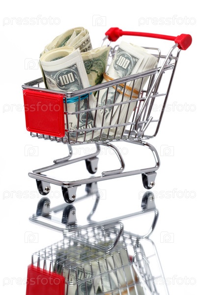 Продуктовая тележка с американскими долларами на белом фоне