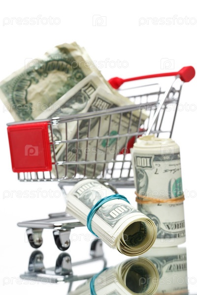 Продуктовая тележка с американскими долларами на белом фоне