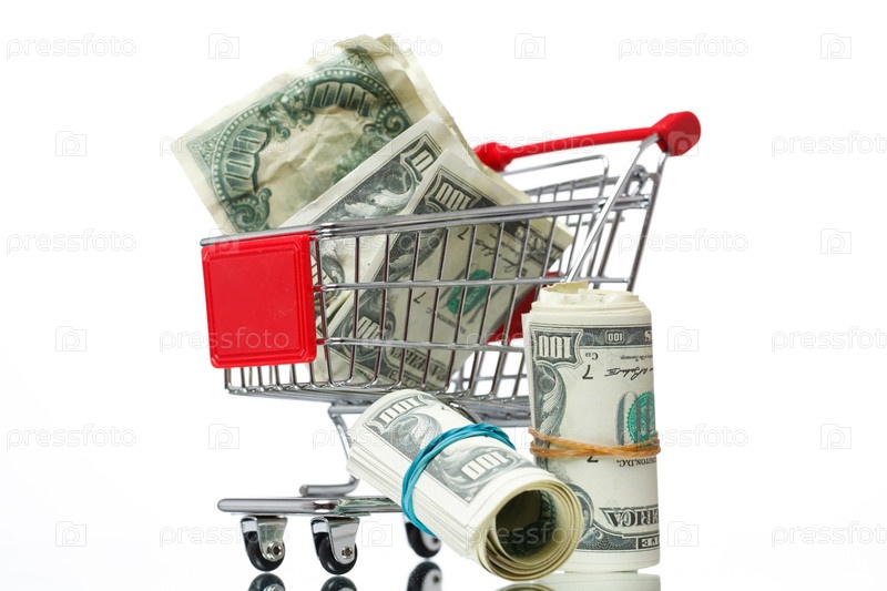 Продуктовая тележка с американскими долларами на белом фоне