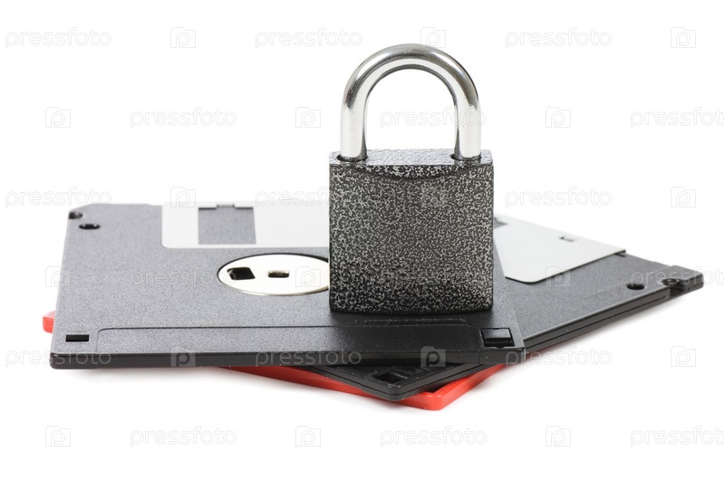 Дискеты и замок на белом фоне