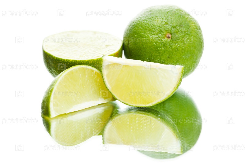 Зеленый целый и разрезанный лимон на белом фоне