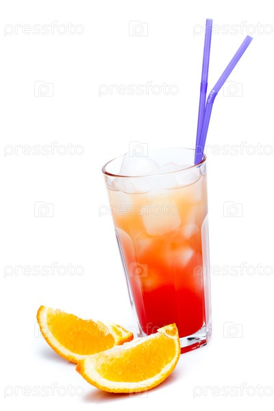Коктейль Текила Санрайз и дольки апельсина на белом фоне