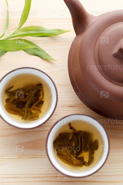 Заварочный чайник и две чашки с зеленым чаем на деревянном столе