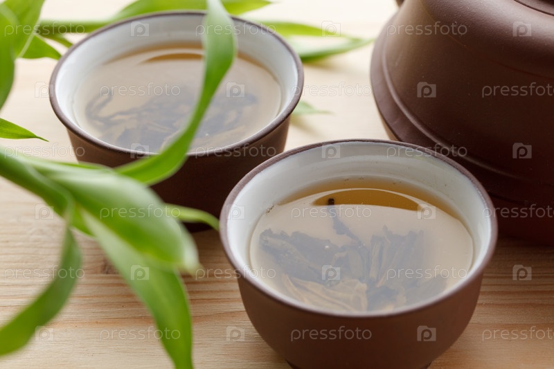 Заварочный чайник и две чашки с зеленым чаем на деревянном столе
