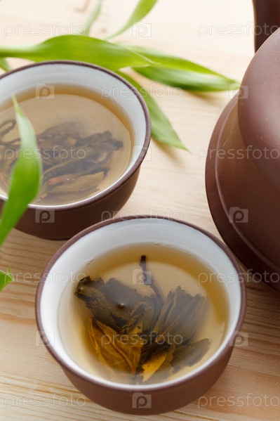 Заварочный чайник и две чашки с зеленым чаем на деревянном столе