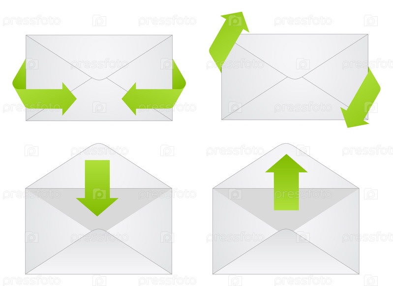Серые конверты с зелеными стрелками на белом фоне