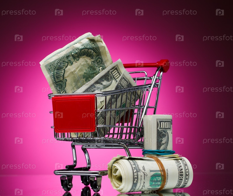 Покупательская магазинная тележка с долларами на розовом фоне