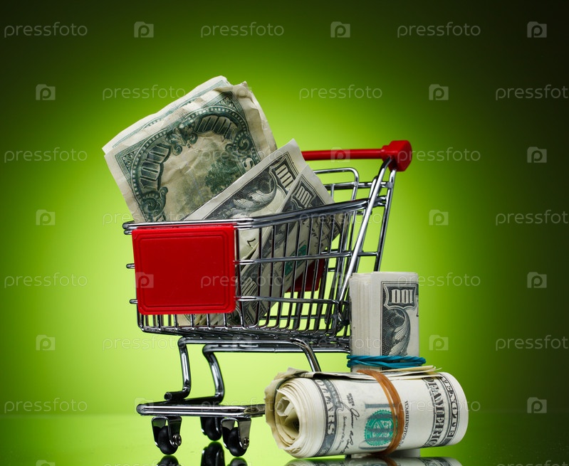 Покупательская магазинная тележка с долларами на зеленом фоне