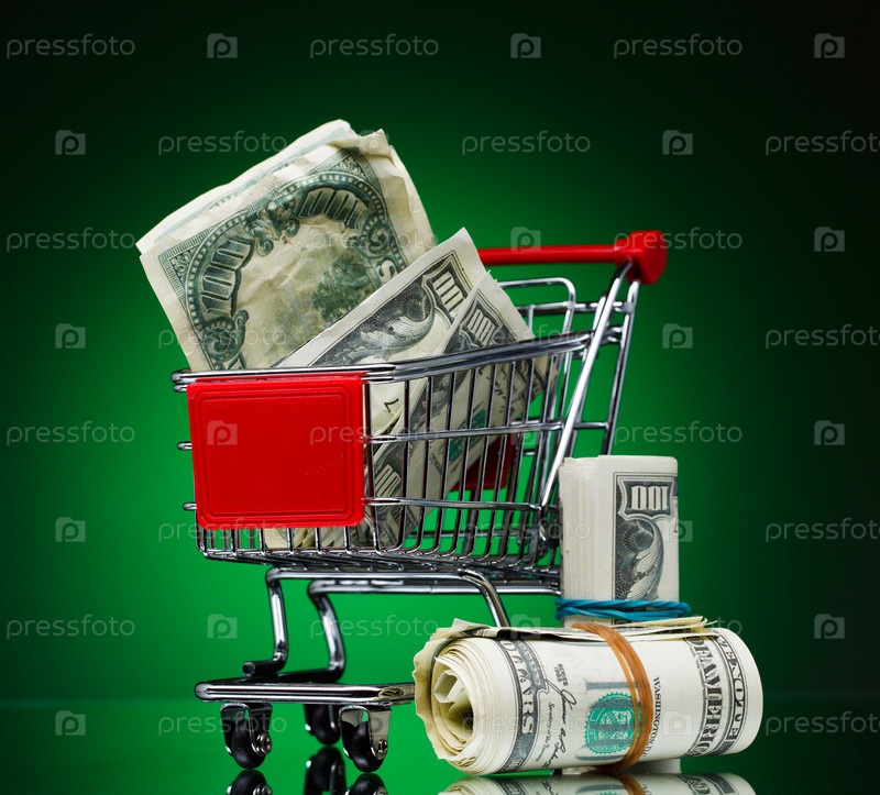 Покупательская магазинная тележка с долларами на зеленом фоне