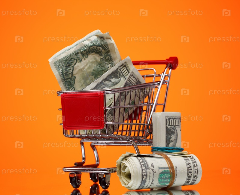 Покупательская магазинная тележка с долларами на оранжевом фоне
