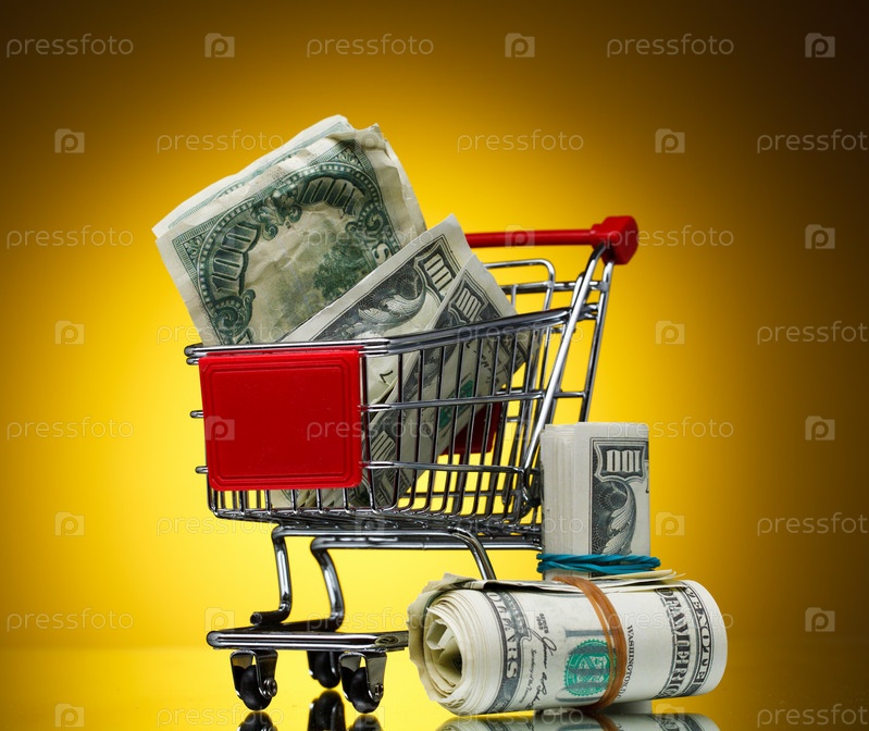 Покупательская магазинная тележка с долларами на желтом фоне