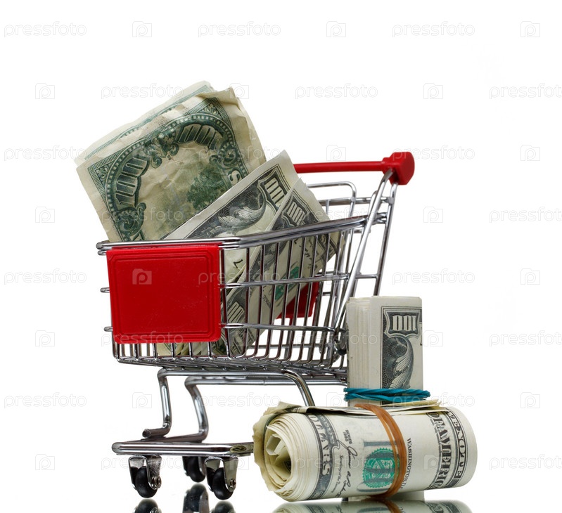 Покупательская магазинная тележка с долларами на белом фоне