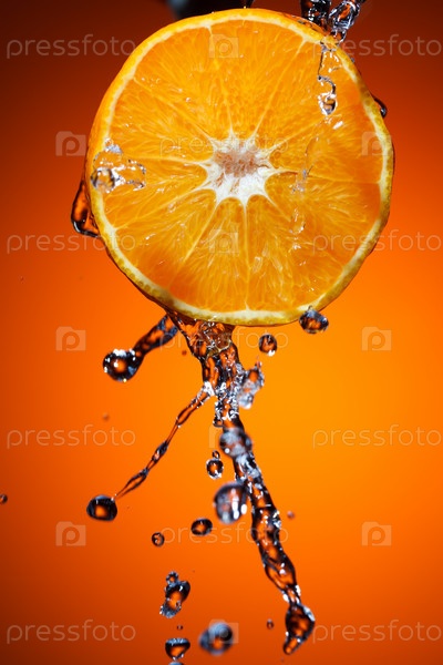 Апельсин с брызгами воды на оранжевом фоне