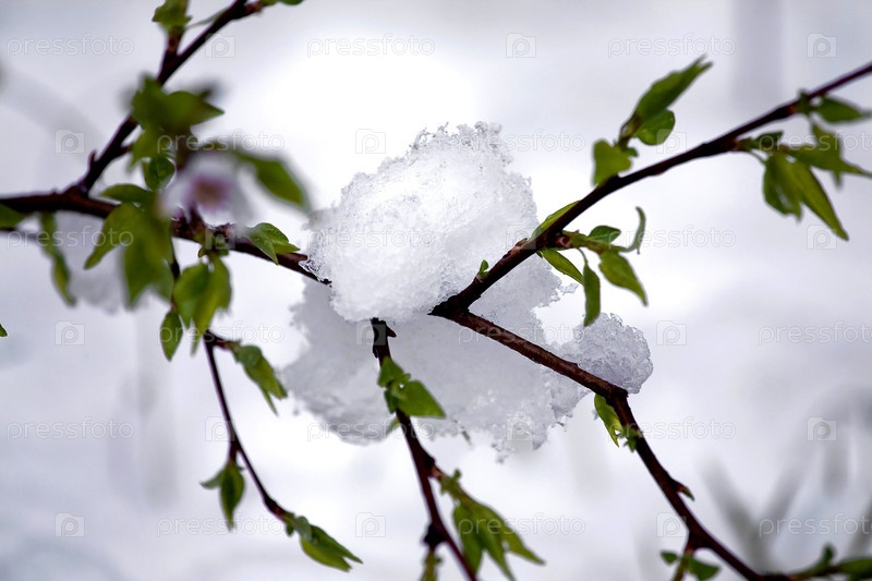 Ветка с молодыми листьями в снегу