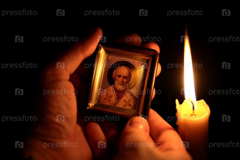 Пламя свечи и икона в руках крупным планом на черном фоне