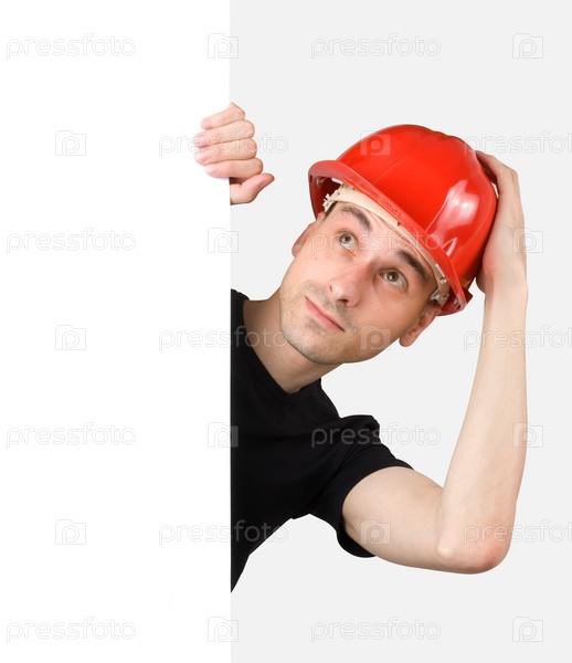 Строительный работник с пустой табличкой