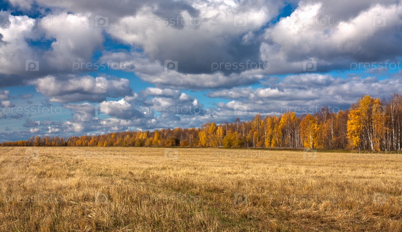 Осенний лес, поле и живописное облачное небо