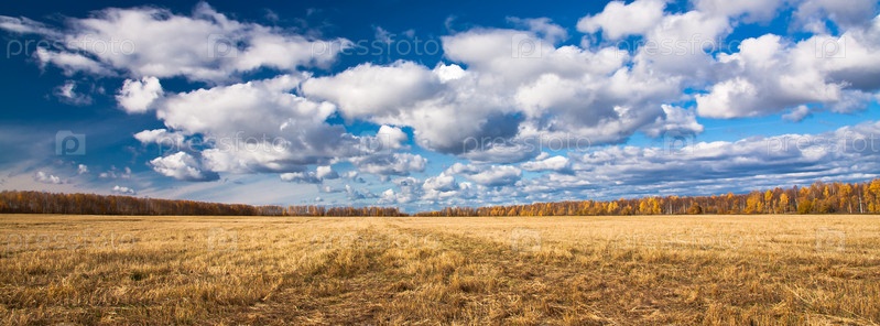 Осенний лес, поле и живописное облачное небо