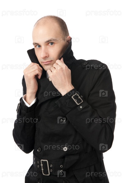 Молодой человек в черном плаще на белом фоне