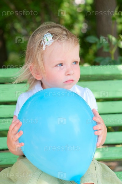 Маленькая девочка, сидящая на скамейке с голубым шариком в руках