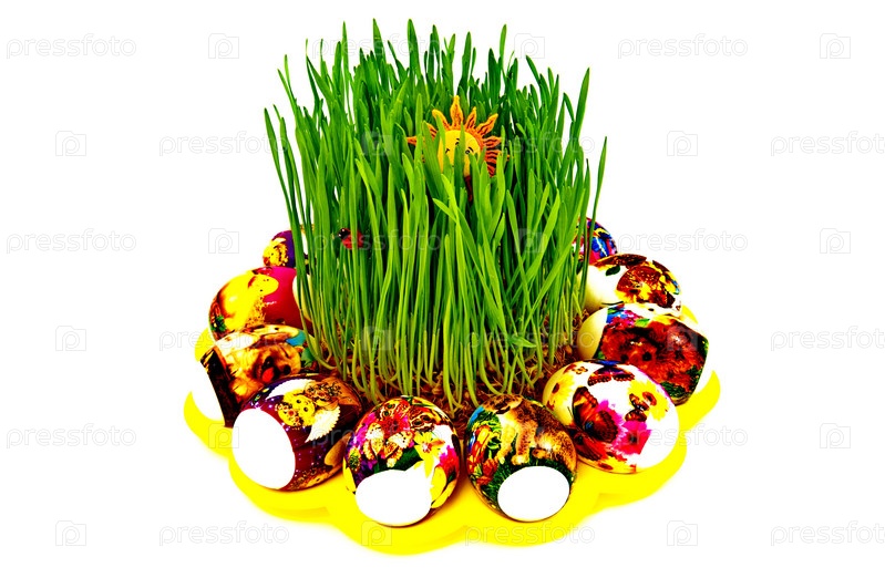 Пасхальные яйца вокруг ростков пшеницы