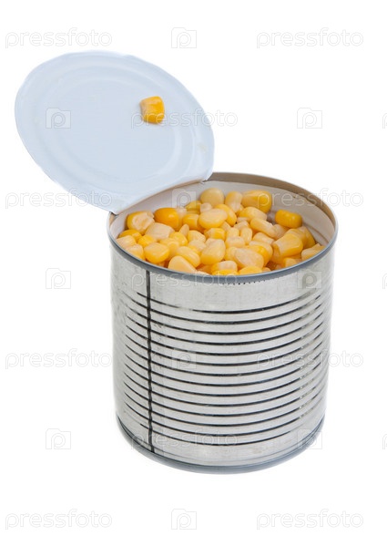 Открытая банка консервированной кукурузы, на белом фоне