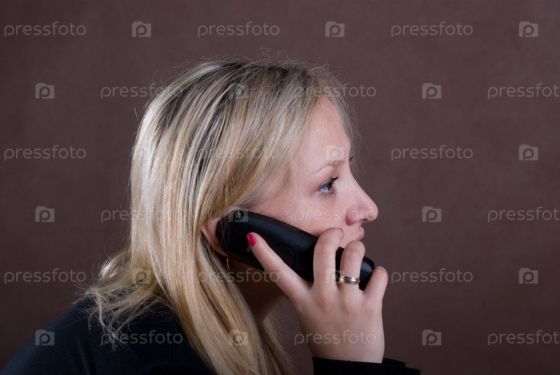 Молодая девушка разговаривает по черному радио на телефон