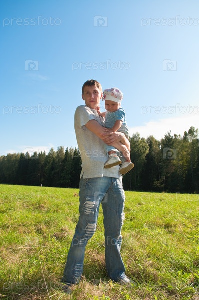 Счастливый отец с маленькой дочерью на руках на зеленом лугу