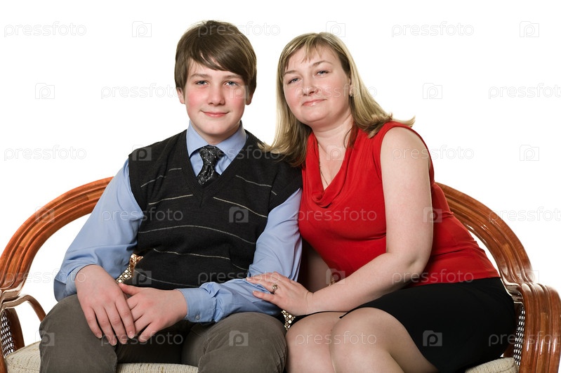 Счастливая мама с сыном-подростком, сидящие на диване на белом фоне